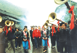 苗族姑娘們,穿鑲花邊衣褲,圍繡花抹裙,扎花絲頭巾,配銀飾花帶,可真叫艷麗。我們這些遠(yuǎn)道而來的游客受到熱烈的迎接,姑娘們用古樸的攔門對歌為我們洗塵。攔門地點是在村頭的小橋邊,姑娘們拉著一排民族織錦帶,滿面春風(fēng)地等待客人,兩邊苗鼓、獅子、嗩吶、甲馬長號夾道歡迎。儀式按苗族風(fēng)俗,由苗族姑娘們先唱熱情的迎客苗歌,再請客人唱歌作客,對歌三次方過攔門第一關(guān)。緊接著她們又捧出大碗苞谷酒向客人們一一敬酒。熱情好客的姑娘們一定要待客人喝了香醇的美酒后,才示攔門結(jié)束。然后,又一路鞭炮,一路號角吹吹打打,把我們請進(jìn)苗寨。