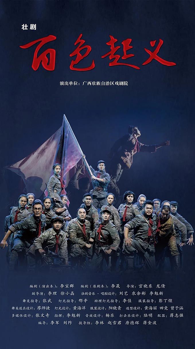 壯劇《百色起義》以1929年發(fā)生在廣西的百色起義為素材創(chuàng)作而成,以百色起義的籌備、舉行為主線,分為初到南寧、群雄聚會、英靈歌唱、百色大地等部分,通過獨具廣西特色的壯劇方式來表現(xiàn)紅色歷史題材,塑造了鄧小平、李明瑞、韋拔群等眾多百色起義指戰(zhàn)員形象,謳歌了舍生忘死、救國救民的革命先烈和為中國革命付出巨大犧牲的壯鄉(xiāng)人民。