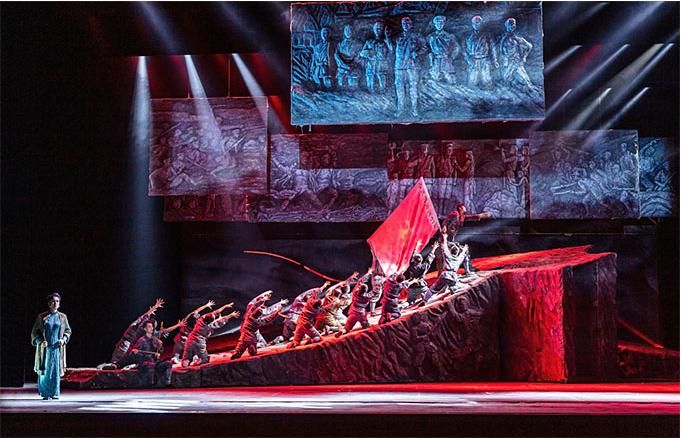在舞蹈語言的設(shè)計上,編導融入當代元素,使觀眾不但感受到審美的親切與現(xiàn)代感,而且還自然地進入回望歷史的情境,對其思想內(nèi)涵的理解更為準確。該劇的道具使用和調(diào)度也頗為大氣,令人印象深刻。一組斜坡狀的大型舞臺道具不但由群眾演員直接移動而實現(xiàn)即時的場景調(diào)度,還可使演員上下和左右而行,最終組合成巨大的中國共產(chǎn)黨黨徽,輔助完成了人民英靈和英雄的形象塑造。