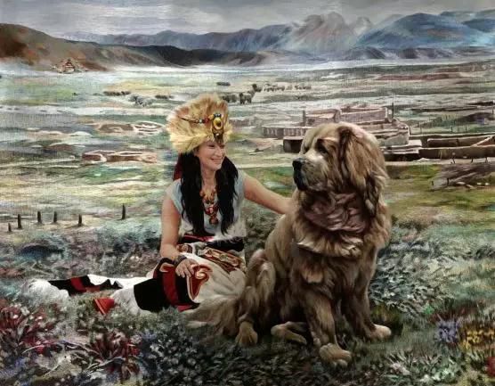 作品采用亂針繡針法和蜀繡傳統(tǒng)施毛針法相結(jié)合的工藝繡制,呈現(xiàn)出藏族少女與藏獒和諧相處的畫面,民族風(fēng)情濃郁,人物塑造逼真。