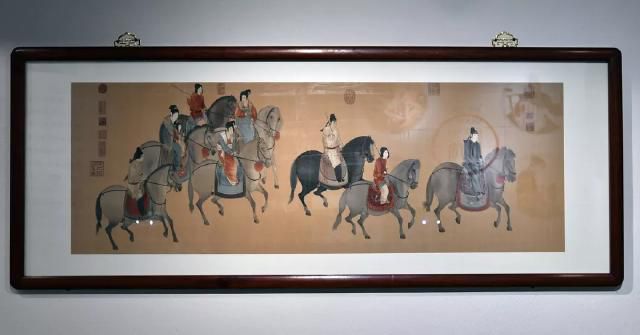 取材于唐代畫家張萱的畫作《虢國(guó)夫人游春圖》和《簪花仕女圖》,作品采用橫織豎裱的方式呈現(xiàn)。