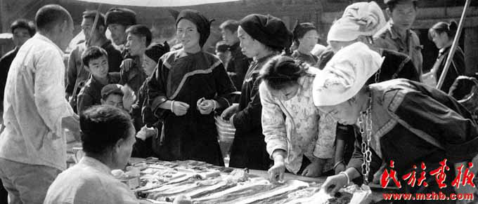 1980年,全國民族地區(qū)落實(shí)黨的民族政策,切實(shí)尊重少數(shù)民族的傳統(tǒng)習(xí)慣,轟轟烈烈地恢復(fù)民族傳統(tǒng)集市,以最短的時(shí)間恢復(fù)生產(chǎn)、發(fā)展自由貿(mào)易、豐富群眾生活。圖為貴州苗族農(nóng)村市場(chǎng)開始活躍起來《民族畫報(bào)》1982年第1期