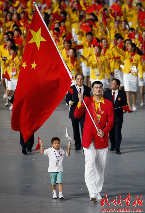 2008年8月8日,全國各族人民期盼已久的第二十九屆奧林匹克運(yùn)動(dòng)會(huì)在北京隆重開幕,圖為北京奧運(yùn)會(huì)中國代表團(tuán)入場(chǎng)儀式上,運(yùn)動(dòng)員姚明領(lǐng)著汶川大地震中最小的救人英雄林浩入場(chǎng)?!睹褡瀹媹?bào)》2008年第9期
