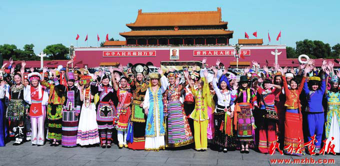 新中國成立以來,黨和國家始終堅(jiān)持把馬克思主義民族理論同中國民族問題具體實(shí)際相結(jié)合,始終堅(jiān)持把民族工作作為一項(xiàng)重大工作來抓,團(tuán)結(jié)帶領(lǐng)全國各族人民共同團(tuán)結(jié)奮斗,共同繁榮發(fā)展,開創(chuàng)了中國特色解決民族問題的正確道路,取得了舉世矚目的成就,積累了彌足珍貴的成功經(jīng)驗(yàn)。2009年10月1日,在北京天安門廣場(chǎng),20萬軍民以盛大的閱兵儀式和群眾游行歡慶新中國60華誕,圖為各民族學(xué)生參加“團(tuán)結(jié)奮進(jìn)”方陣群眾游行?!睹褡瀹媹?bào)》2009年第10期