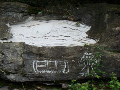 筆者在該村所見的具有“文化生態(tài)村”建設痕跡,除了村口巨石上鐫刻的文字外,還修建了一條貫通項目組專家們規(guī)劃的“文化生態(tài)展示區(qū)”的石板路,并在作為展示重要文化景觀的地方豎立了介紹或解釋性的文字標牌。如,村口、山神廟前、摔跤場等都立有介紹的招牌。讓筆者疑惑和認為不應該“改造”的是在村民們的祖靈洞巖壁上的“藝術石刻”(見圖)。從筆者與村民的訪談和項目組的總結報告資料中,可以把文化生態(tài)村建設試點項目組在月湖開展的文化保護工作歸結為如下幾個方面: