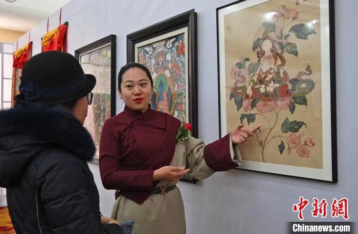 王天文是該協(xié)會(huì)為數(shù)不多的女性,自幼學(xué)習(xí)國(guó)畫。此次她的展出作品《花與佛》進(jìn)行了唐卡創(chuàng)新,將漢地工筆繪法的花卉與唐卡白度母形象融合。因?yàn)闊釔鄄匚幕?011年她從家鄉(xiāng)河北到西藏學(xué)習(xí)唐卡,希望能探索唐卡與不同繪畫種類方式的結(jié)合。