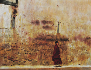 在麗江的束河古鎮(zhèn),他坐在小溪邊,吹著清涼的微風(fēng),聽(tīng)著對(duì)面咖啡屋傳來(lái)的低吟慢唱,心情舒暢地畫(huà)著自己的畫(huà)。很快,一幅《水邊咖啡屋》就在這不經(jīng)意間誕生了。在梅里雪山,早晚都能看到人們所說(shuō)的日照金山的美景,打開(kāi)窗戶,暖陽(yáng)透進(jìn)來(lái)照在身上,就這樣畫(huà)著藏族人心中的神山,他覺(jué)得實(shí)在找不出還有比那一刻更美好的感覺(jué)了。