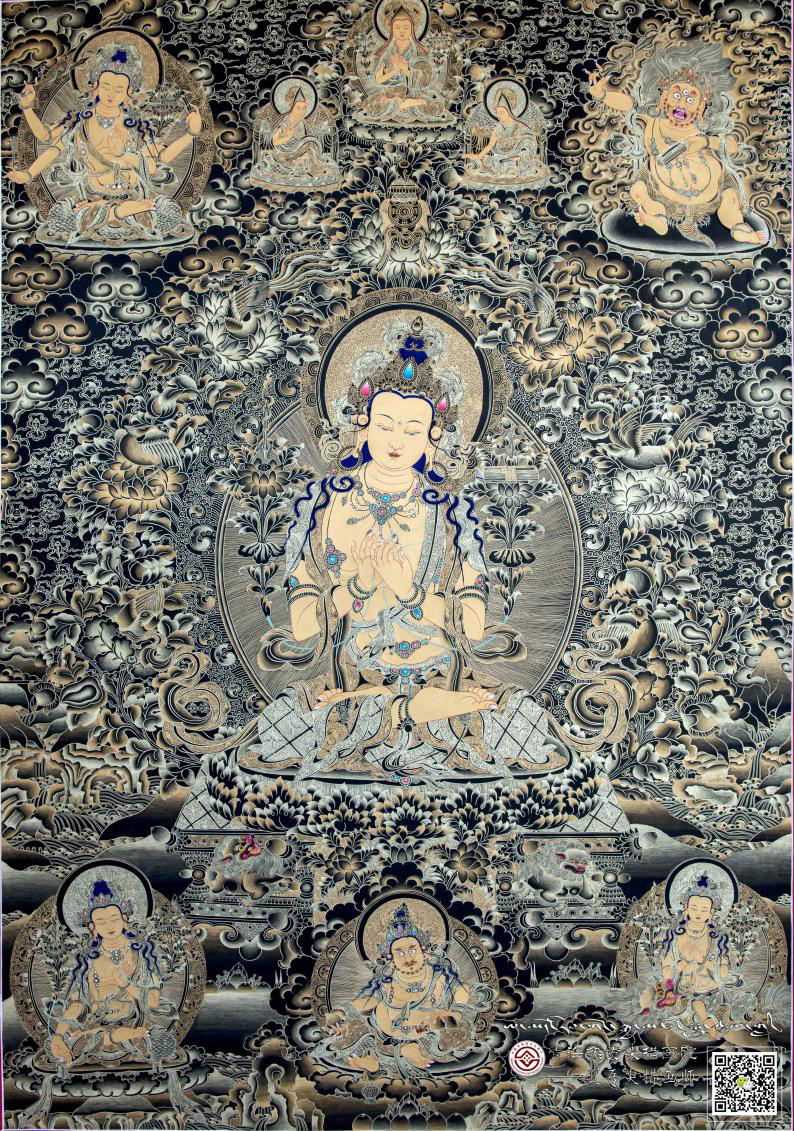 這幅唐卡的主尊是文殊菩薩,主尊左下側(cè)是黃文殊菩薩,中間為黃財(cái)神,右下側(cè)是文殊師利菩薩。上方左側(cè)供奉為四臂文殊菩薩,中間供奉為格魯派創(chuàng)始人宗喀巴大師尊者,大師左右供奉為兩大弟子克主杰,甲嚓杰尊者 上方右側(cè)供奉為金剛手菩薩。遠(yuǎn)景描繪了各種花蕊、山水、祥云等畫(huà)家妙用了藏族傳統(tǒng)唐卡藝術(shù)技法和自己的畫(huà)風(fēng)融合而繪制成的一幅獨(dú)特的創(chuàng)作,整幅畫(huà)面播散著宗教的靜謐光輝。