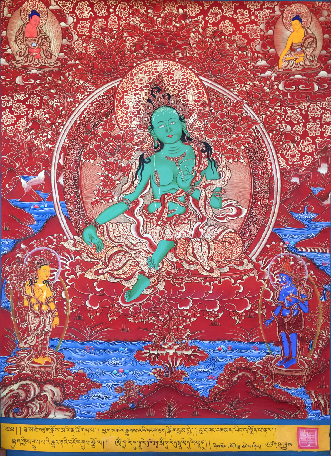 綠度母即觀世音菩薩之化身,為二十一度母之主尊,持通本尊咒,能總持二十一度母之功德。修持此尊密法,能斷生死輪回,消除一切魔障、業(yè)障,并能消災(zāi)增福,延壽廣開智能,凡有所求無不如愿成就,且命終往生極東世界。唐朝的文成公主咸信是綠良母的化身。