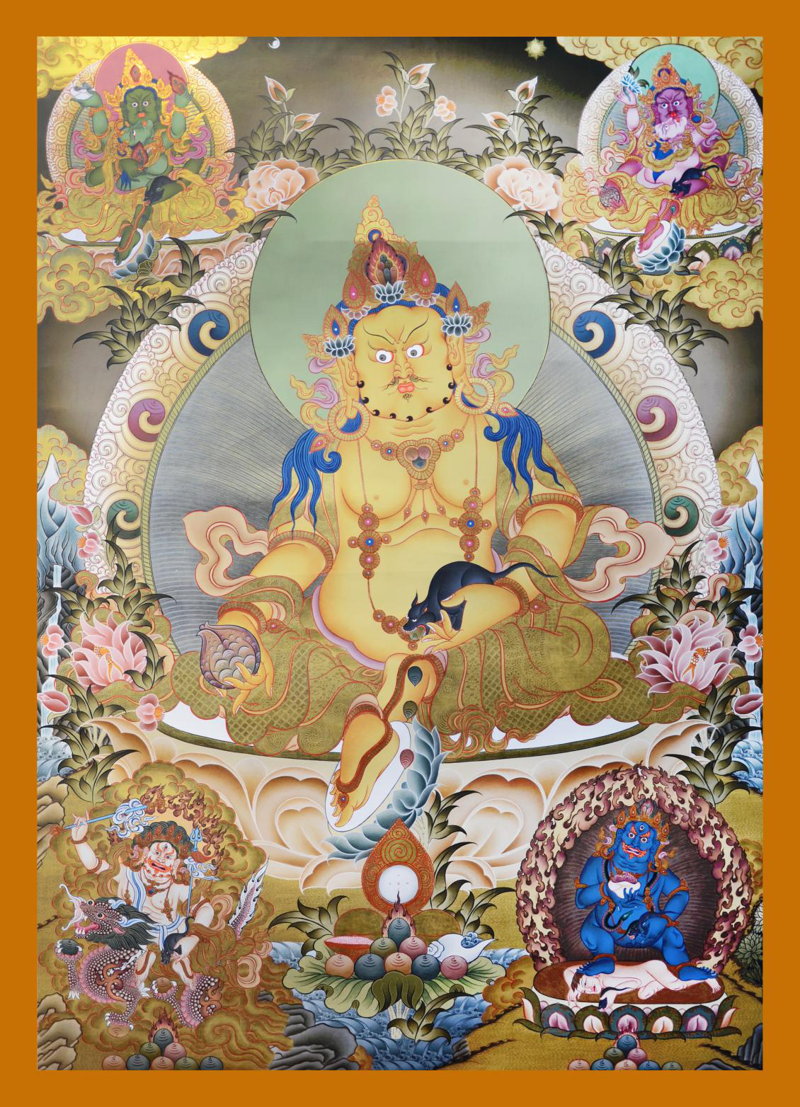 黃財(cái)神一面二臂,五佛冠為頭飾,矮小肚大,雙臂勁力,右手持布拉噶如意寶,左手提著吐寶鼠,身著天衣,藍(lán)蓮花及珠寶瓔珞作裝飾,胸前掛念珠。左足屈,右足踩著海螺寶,以如意姿安座于蓮花月輪之上。