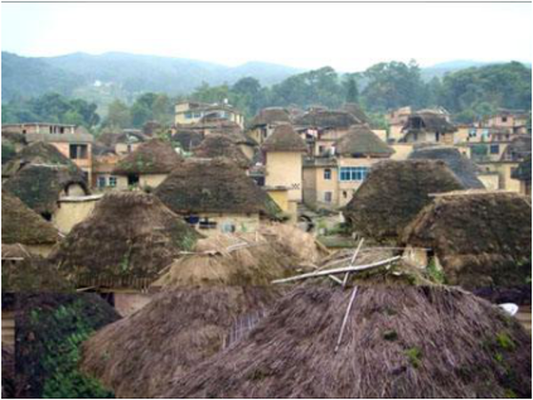 哈尼族一個(gè)核心的家庭的一幢完整的磨菇房,包括正房、左右?guī)?、庭院和圍墻等?shù)個(gè)建筑單元,家中配有腳碓、石磨、水缸、織機(jī)、藍(lán)靛染缸、犁、耙、刀、斧、鋤、籮和火塘等生產(chǎn)生活設(shè)施,滿足作為社會生產(chǎn)和生活單位的家庭的諸多需求。若干家庭的磨菇房逐次排列,就逐漸變成了一個(gè)哈尼族山寨的磨菇房群落。