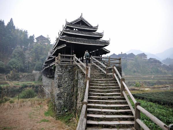 風雨橋以石拱木作,廊、屋、亭、閣為一體,造型別致、美不勝收。無論是遠眺還是進觀,都體現(xiàn)出獨特的審美意境。鏈接廊橋與屋亭的是長條青石,橋與村寨的連接則用花石鋪路,橋面主體是當?shù)厮寄静?。這種自然生態(tài)環(huán)保的理念,更彰顯了瑤族人民獨特的審美境界。