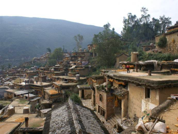 彝族是農(nóng)牧兼營(yíng)的民族,村寨的分布與坐落有其獨(dú)特的傳承。彝族的村寨多坐落在海拔2000~3000米的山區(qū)、半山區(qū),相沿聚族而居。為適應(yīng)西南地區(qū)亞熱帶氣候和山地特點(diǎn),彝民們便就地取材,以一種最容易、最節(jié)省錢財(cái)人力的建房方式,創(chuàng)造出中國(guó)建筑的獨(dú)特樣式——土掌房。土掌房多建于山地斜坡上,以石為墻基,用土坯砌墻或用土筑墻,墻上架梁,梁上鋪木板、木條或竹子,上面再鋪一層土,經(jīng)灑水抿捶,形成平臺(tái)房頂,不漏雨水。有的大梁架在木柱上,擔(dān)上墊木,鋪茅草或稻草,草上覆蓋稀泥,再放細(xì)土捶實(shí)而成。