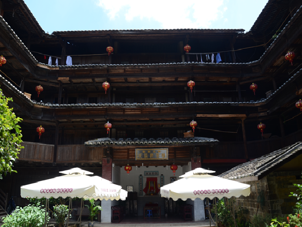 一座土樓就是一個(gè)藝術(shù)殿堂。每一座土樓,又如同一個(gè)“大家族,小社會(huì)”。土樓內(nèi),居住在同一屋頂下的幾十戶(hù)幾百人同祖同宗同血緣同家族,過(guò)著共門(mén)戶(hù)、共廳堂、共樓梯、共庭院、共水井的和睦生活。這種聚族同樓而居的生活模式,典型地反映了客家人的傳統(tǒng)家族倫理和家族的親和力。而且,樓內(nèi)的客家人,住著層數(shù)相同、開(kāi)間面積相等、無(wú)明顯朝向差別、更無(wú)貴賤等級(jí)之分的均等居室。平等聚居,反映了客家人融洽和睦的家風(fēng)和平等團(tuán)結(jié)的傳統(tǒng)。