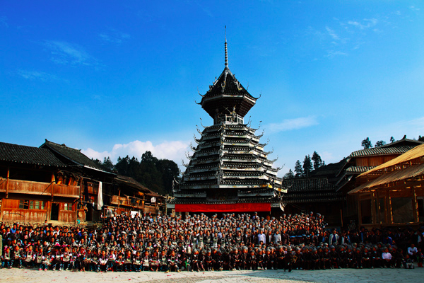 每年的農歷八月十五中秋節(jié),小黃都會舉行賽歌會,有幾十上百人唱歌的壯觀場面,是觀賞侗歌的最佳時機。侗族的大歌表演常在鼓樓舉行。侗族的鼓樓、風雨橋和大歌是侗族原生文化最突出的標志,被稱作“侗寨三寶”。鼓樓是侗族村寨的標志性建筑,形似巨大的杉樹,村民稱之為“遮蔭樹”。在沒有鼓樓的年代,人們的許多活動是在古杉樹下進行的。后來,為了滿足社會和文化活動的需要,修建固定建筑物時便以杉樹為原型。文獻資料稱:“侗人居溪峒中,春以巨木埋地作樓,高數(shù)丈,歌者夜則緣宿其上。”這就是最初的“鼓樓”。
