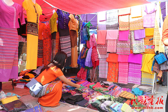 慶典活動上人潮涌動,氛圍隆重。位于文化廣場的演出中心區(qū),傣族情歌對唱、孔雀舞表演、傣拳武術表演、傣劇等節(jié)目輪番上臺。在舞臺四周,一座座簡易搭建的攤位前,賣有傣族服飾、貨品、傣文書籍等。街道兩旁的小吃一條街,擺有竹筒粑粑、撒撇、楂子、地瓜等特色美食。