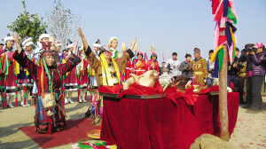 赫哲族漁民捕魚時首先要舉行隆重的祭江儀式。今年的捕魚開江儀式和大馬哈漁獵文化節(jié)同時舉行,由當?shù)睾照茏宕笏_滿尤軍帶領眾人在烏蘇鎮(zhèn)的抓吉山下的江邊舉行。抓吉是赫哲語“濕地上一片高崗”的意思。赫哲族的漁民們認為,捕魚是向大江索取,因此,捕魚前必須要祭江神,以保佑漁民出江出海平平安安,滿載而歸。