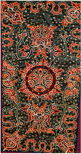 第四步是刺繡,包括三個(gè)環(huán)節(jié),即固定框架圖案、填芯和鑲邊。固定框架圖案,即用一根大針將馬尾線穿好,再用另一根稍小的針穿上同色絲線,然后一邊用馬尾線在布面上鑲成各種圖案,一邊用穿有絲線的小針將圖案固定在布面上。填芯,即用各色絲線將固定好的圖案空隙部分填滿。鑲邊,即用橙色和黑綠色絲線在四周挑繡成鑲邊圖案。
