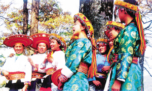 這是一個特別愛美的民族。男人們著裝瀟灑隨意,頭纏黑白相間的方格頭帕,倍顯英俊。女人們則身穿黛藍(lán)色對襟長衫,鑲著的紅布邊和紅布扣純?yōu)檠b飾。下著素艷相融的花裹裙,腰纏五顏六色的腰帶,頭上再配一個后面吊有長長彩須、狀似倒扣斗篷的火紅頭巾,把個茫茫綠野點綴得山花爛漫、如畫如詩。