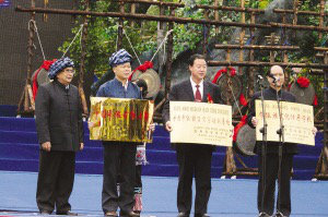 貴州省布依學會會長王思明(左一),向望謨縣授予“中國布依古歌之都”和“中國布依語言文字培訓基地”之牌
