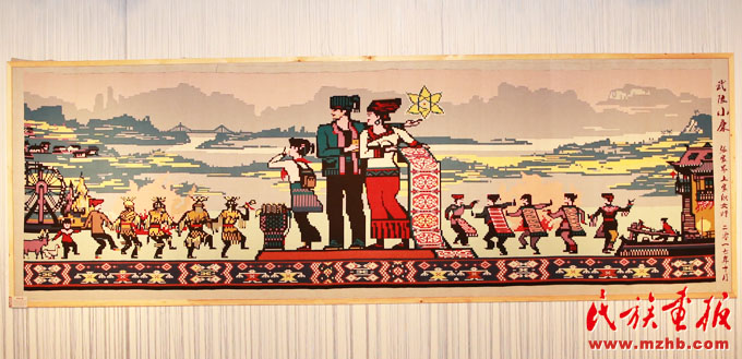 中國民族博物館從全國土家族聚居區(qū)征集的300多幅藏品中精心挑選出156幅土家織錦精品,120余張土家風情照片和21分鐘土家織錦傳承人視頻,展覽分為“五彩斑衣——土家織錦歷史回眸”“天工巧織——土家織錦工藝流程”“薪火相傳——土家織錦傳承人錄”和“錦繡武陵-——土家織錦品類縱覽”四大部分,生動全面地展示了國家級非物質文化遺產項目——土家織錦的藝術特色與文化價值。本次展覽的代表性文物有1950年中南軍政委員會田心桃代表贈送給毛主席的禮物土家織錦《滿天星》,湖南省級傳承人葉菊秀主持創(chuàng)作的巨幅長卷《民族大團結》(寬60厘米、長1210厘米)。特別值得一提的展品是長450厘米、寬150厘米的土家織錦《武陵小康》,織錦配色達30余種,調制有132712個色塊。這是張家界市170萬各族兒女為迎接黨的十九大勝利召開,表現(xiàn)土家織女們對精準扶貧成果的欣喜,而由近百位土家織女歷時五個多月制作而成的巨幅織錦,也是第一次在國家級專題博物館公開展出。