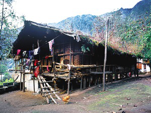 在怒江上游峽谷聚居的傈僳村寨都建在高山的半山上,其民居俗稱為“千腳落地房”。說“千腳落地”雖有些夸張,但也足以形象地說明峽谷溫?zé)岬臍夂蚝蜕礁咂露傅牡乩項(xiàng)l件。在雨季時(shí),“千腳”阻力最小,使山洪順利傾瀉而下,又很快干爽,免受潮氣。而且不需挖地動土,不必移石砌墻,對木料沒有過高要求,長短皆用,在生態(tài)脆弱的高山峽谷也算環(huán)保建筑。“千腳落地”是因建房時(shí)先在確定的屋基上依斜坡程度和住房面積打進(jìn)數(shù)十根到百余根木樁為基樁,以保證居室樓板的平正?;鶚洞蚝煤螅拿媪魩赘咧鳛檎麄€房屋的立柱外,在密集木樁所形成的平面上滿鋪竹篾編織的樓板,還有竹篾圍墻,所有結(jié)構(gòu)皆用竹篾綁扎。屋頂鋪苫草或蓋木片瓦,近幾年,已陸續(xù)換上了大塊的水泥波形瓦。房門開在山墻一側(cè),有廊道,可做曬臺,平時(shí)穿的衣服都搭在這兒,也是婦女做針線活的地方。隨著怒江峽谷的開發(fā)和新農(nóng)村建設(shè)的深入,通路的村寨將很快會改變面貌。