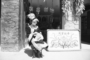 午后,張國麗文文靜靜地坐在店前刺繡,繡帕上是一對鮮活的鴦鴦。“瀟灑、飄逸、俊秀是張國麗刺繡創(chuàng)作的風格,許多來旅游的人都是這樣評價的。她獨樹一幟,盡情彰顯了羌風羌韻?!痹樠鄧烂C認真地解說。