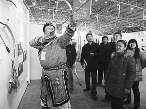 日前,在北京舉行的非遺生產性保護成果大展上,幾名觀眾圍攏在一個身材魁梧的錫伯族老人周圍,但見他身罩長袍,足踏薄底靴,雙目圓睜,兩臂運力搭弓上箭,儼然就是準備步射的驍將。這位老人就是錫伯族傳統(tǒng)弓箭技藝傳承人伊春光,老漢手中的弓重近1公斤,是他親手制作的。