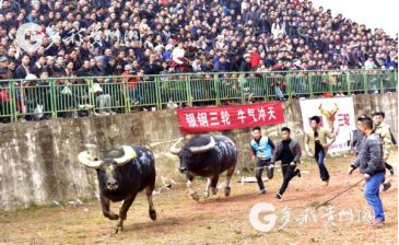 貴州省從江縣第十五屆原生態(tài)侗族大歌節(jié)的前一天,恰逢該縣逢亥斗牛日,丙妹鎮(zhèn)松學(xué)斗牛塘、谷坪鄉(xiāng)四寨河斗牛塘同時(shí)舉辦傳統(tǒng)牛王爭(zhēng)霸賽,喜迎一年一度“侗族大歌節(jié)”的到來,共有來自周邊村寨的80頭水牯牛參戰(zhàn),斗?;顒?dòng)場(chǎng)上名牛角逐,場(chǎng)面異彩紛呈,吸引數(shù)萬名觀眾前來觀戰(zhàn)。
