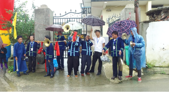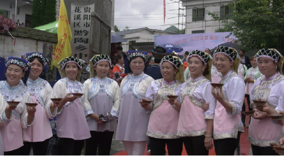 布依族青年們抬著族中神物銅鼓,吹著長(zhǎng)長(zhǎng)的號(hào)角,臉上滿(mǎn)是對(duì)民族節(jié)日的期待之情,驕傲又興奮;成群結(jié)隊(duì)的孩童穿著本民族傳統(tǒng)服飾,手拿錦帶,熱忱歡迎遠(yuǎn)道而來(lái)的客人;能歌善舞的布依阿姐笑臉相迎,唱著布依族的歌謠,一字排開(kāi)堵在門(mén)前,客人們想要進(jìn)去參加這次盛會(huì),就得過(guò)三關(guān),干了三碗攔路酒。
