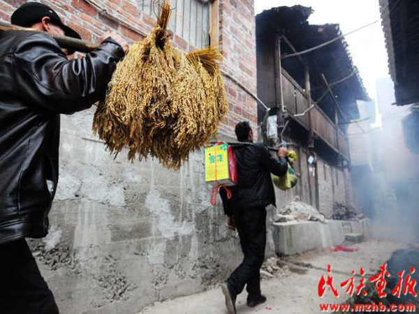 賀禮是街坊鄰居送給新娘家的禮品,在婚禮結(jié)束后的第一天下午進行。送賀禮由中老年婦女承擔(dān),送時或單獨或結(jié)伴而行,禮品或手提或裝在竹筐里,一般都要帶上若干份,每戶一份,一次送完。禮品送到新娘家后,新娘家要進行登記并送幾塊餅干糖果以表謝意。