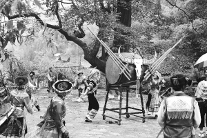 每年農(nóng)歷正月初二至十五花山節(jié),主人與遠道而來的客人共同歡慶。他們圍成一圈,喝著燒酒,跳起歡快的苗家舞蹈,唱著動聽的民歌,一天的勞頓、一年的艱辛,被熱烈的燒酒驅趕著,被歡愉的歌舞浸潤著,被悠揚的蘆笙旋律激蕩著。蘆笙、燒酒、蠟染,精美古樸的苗族服飾,木槽里錘打的糍粑……與四周山山水水一同融匯,幻化成一個民族的標識。