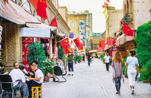 喀什古城從2010年至2015年,經(jīng)過5年整修改建,有效保護(hù)和傳承了老城區(qū)歷史文化風(fēng)貌。家家戶戶在門前懸掛國旗,表達(dá)對祖國的美好祝福。