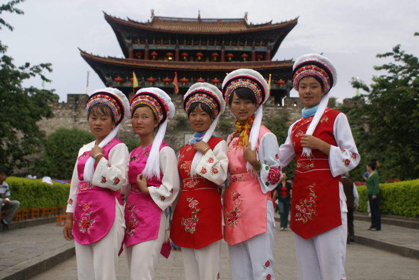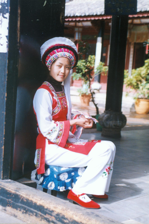 一直以來(lái),享有“金花”美譽(yù)的白族婦女的服飾,更是色澤鮮美、絢麗多彩。大理一帶的婦女多穿白上衣、紅坎肩或是淺藍(lán)色上衣配絲絨黑坎肩,右衽結(jié)紐處掛“三須”“五須”的銀飾,腰間系有繡花飄帶,下著藍(lán)色寬褲,腳穿繡花的“白潔鞋”。手上多半戴紐絲銀鐲、戒指。已婚婦女梳發(fā)髻,未婚少女則垂辮或盤辮于頂,有的則用紅頭繩纏繞著發(fā)辮下的花頭巾,露出側(cè)邊飄動(dòng)的雪白纓穗,點(diǎn)染出白族少女頭飾和發(fā)型所特有的風(fēng)韻。劍川一帶的年輕女子則又喜戴小帽或“魚(yú)尾帽”。洱源西山及保山地區(qū)的白族婦女常束發(fā)于頂,上插銀管,再以黑布包頭,穿右襟圓領(lǐng)長(zhǎng)衣,系繡花腰帶,衣袖和褲腳喜鑲繡各色寬窄不同的花邊,有的還喜束護(hù)腿,顯得十分勻稱協(xié)調(diào)和俊俏美觀。總之,各地白族的服飾雖呈現(xiàn)出某些地區(qū)性的差異,但都色彩明快、映襯協(xié)調(diào)、挑繡精美、古雅端莊。