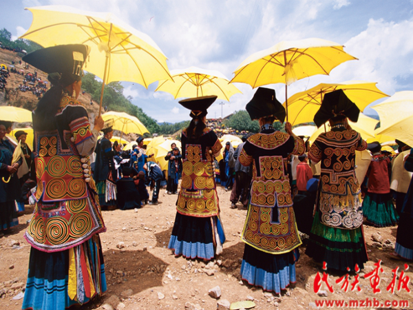 四川涼山彝族婦女的衣裙上繡滿(mǎn)黃色花朵