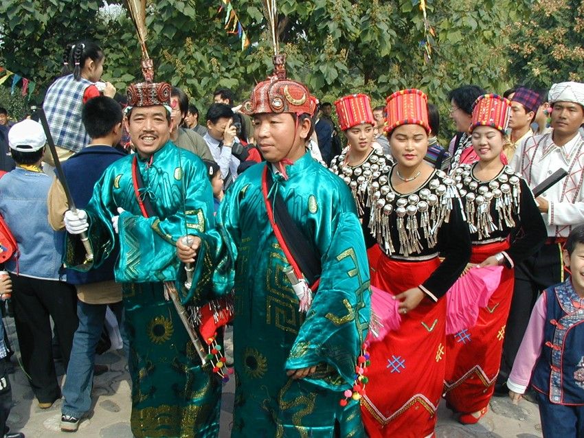 目瑙節(jié):又稱“總戈”,景頗語音譯,意思是“大伙跳舞”。目瑙節(jié)是景頗族最盛大的傳統(tǒng)節(jié)日,一般于每年農(nóng)歷正月十五以后的九天內(nèi)擇雙日舉行,節(jié)期三至五天不等。目瑙作為一種大型的群眾性歌舞活動(dòng),由來已久,歷史上,每逢豐年,出征、凱旋、婚姻嫁娶、敬祭鬼神等重要活動(dòng),均要跳“目瑙”。景頗族的“目瑙縱歌”原來是一種融宗教和文化習(xí)俗為一體的傳統(tǒng)慶典。隨著社會的發(fā)展,逐漸演化為各種不同類別的“目瑙”。大致有以下幾種:①“歲目瑙”,家庭財(cái)源茂盛,人丁興旺時(shí)舉行;②“布當(dāng)目瑙”,征戰(zhàn)取得勝利時(shí)舉行;③“貢冉目瑙”,同胞兄弟分家自立門戶時(shí)舉行;④“騰肯目瑙”,新建房屋住所落成時(shí)舉行;⑤“空然目瑙”貴族家娶親辦婚禮時(shí)舉行;⑥“達(dá)如目瑙”,出征時(shí)舉行;⑦“昔目瑙”,有名望的長者去世送葬時(shí)舉行;⑧“柱目瑙”,祭奠“木代”神時(shí)舉行。不同類別的“目瑙”都有特定的內(nèi)容和表現(xiàn)形式,但有一個(gè)共同點(diǎn)就是整個(gè)過程都是由“瑙雙”(領(lǐng)舞)隊(duì)和“瑙巴”(表演)隊(duì)組成的舞隊(duì)來表現(xiàn)和完成的。每逢目瑙節(jié)日,村村寨寨的景頗人身著節(jié)日盛裝,紛紛從四面八方涌入目瑙廣場。廣場上人山人海,氣氛熱烈歡快而不失莊嚴(yán)古樸的特色。廣場中央高豎著四根長約4米的目瑙柱,亦稱雌雄柱,中間兩根為陰,外面兩根為陽,上面皆繪有精美而富有象征意義的圖案:右邊柱上往往繪以蕨菜花紋,象征團(tuán)結(jié)奮進(jìn);左邊常畫回紋構(gòu)成若干個(gè)四方形,并涂以不同顏色,表示景頗族的遷徙路線;中間兩根柱子之間,交叉著兩把長刀,為景頗民族驍勇強(qiáng)悍、堅(jiān)強(qiáng)剛毅性格的具體標(biāo)志。目瑙柱的左側(cè)立著一個(gè)方形架子,上層是吹嗩吶的座位;前面掛著一個(gè)兩米長的大皮鼓和一面直徑一米多的大芒鑼,供跳舞時(shí)伴奏用。廣場四周用竹籬笆圍起,目的是為了防止野鬼的侵入和牲畜的干擾。舞蹈開始時(shí),鼓樂齊鳴,由兩位德高望重且又熟悉目瑙舞路線的老人身穿大龍袍,頭戴飾有孔雀、野雞羽毛和野豬牙齒的目腦帽,手持長刀領(lǐng)頭,后面跟著背銅炮和持長刀的隊(duì)伍,婦女們拿著扇子或彩帕跟在最后,邊歌邊舞,熱鬧非凡。參舞者少則百多人,多則幾千人,從清晨到日暮,以日暮到清晨,通宵達(dá)旦,其間舞者跳累時(shí)可自動(dòng)退場小歇片刻,然后繼續(xù)登場舞蹈。“目瑙縱歌”作為一個(gè)民族的傳統(tǒng)活動(dòng)發(fā)展至今,宗教色彩和類別已日益淡化,它已成為景頗族約定俗成的傳統(tǒng)節(jié)日,統(tǒng)稱為“統(tǒng)肯(傳統(tǒng))目瑙”并賦予了新的內(nèi)涵,其內(nèi)容和形式都是展示一個(gè)民族的傳統(tǒng)文化,反映今天的新生活和對未來的美好向往。