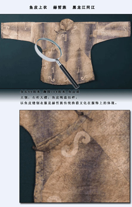 赫哲族的魚皮衣歷史久遠。我國古代文獻《山海經(jīng)》第九卷《海外東經(jīng)》中便有“玄股之國,在其(黑齒)北,其為人衣魚食鷗” 的記載?!耙卖~”西晉學者郭璞解釋為“以魚皮為衣也?!闭f明早在兩千多年前,赫哲族的先民就已使用魚皮做衣服了。另據(jù)密山新開流新石器時代遺址中出土的魚叉及骨針,證明赫哲族的先民捕魚和縫制魚皮衣有數(shù)千年歷史了。清代張晉彥的《寧古塔山水記》有:“魚皮部落,食魚為生,不種五谷,以魚皮為衣,暖如牛皮”的記載。《皇清職貢圖》記載:“赫哲衣服多用魚皮而緣以色布,邊綴銅鈴,亦與鎧甲相似。”另外,地方志書對此也多有記載??梢?,赫哲族制作和穿著魚皮衣是真實而久遠的。