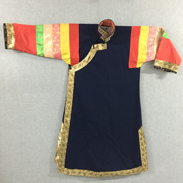 民族文化宮博物館收藏的這件立領(lǐng)右衽大襟五色袖“彩虹衣”,是土族女子盛裝時(shí)的一種服飾,征集于青海省互助土族自治縣。年代為20世紀(jì)30年代?!安屎缫隆遍L(zhǎng)117厘米,胸圍120厘米,袖長(zhǎng)59厘米,棉質(zhì)。整件女服右衽大襟,藍(lán)棉布襯里,左右側(cè)開衩,黑色“拉花”立領(lǐng),領(lǐng)上以土族傳統(tǒng)刺繡工藝—盤繡刺繡紅綠相間圓形圖案和辮形線條,綴三枚金色圓銅扣。衣袖為紅、黃、綠、白、粉五色彩布、彩緞拼接的“彩虹袖”,其中紅色為主色,占整個(gè)衣袖約一半面積,其余四色布?jí)K相鄰,均勻分布于衣袖上方,布?jí)K上刺繡有金色梅、蘭、竹、菊?qǐng)D案。衣袖袖口鑲寬約3厘米黑色絲絨底刺繡花邊,花邊里外均繡有花草紋樣,做工精致?;ㄟ吷辖訉捈s10厘米金色牡丹紋花邊,與襟邊、下擺、衩口等處所貼金色牡丹紋花邊相互呼應(yīng),極富設(shè)計(jì)感。