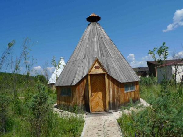 撮羅子的選址,是在地勢較高、陽光能照射到而且水和柴草就近可取的平坦之處。其蓋造方法,是用三五根約碗口粗細上有枝杈的木桿,相互交合搭成上聚下開的骨架,然后再用30根左右木桿搭在骨架之間捆綁固定,在南面(或東面)留出門,即基本成型。木桿搭起的只是“屋架”,外面還要覆蓋才能遮風(fēng)擋雨。按照季節(jié)的不同,分別用樺樹皮、草簾子和犴、狍等獸皮,做成自上而下一層壓一層的圍子,綁在木桿上,門簾則夏用草或樹條編,冬用狍皮做成。