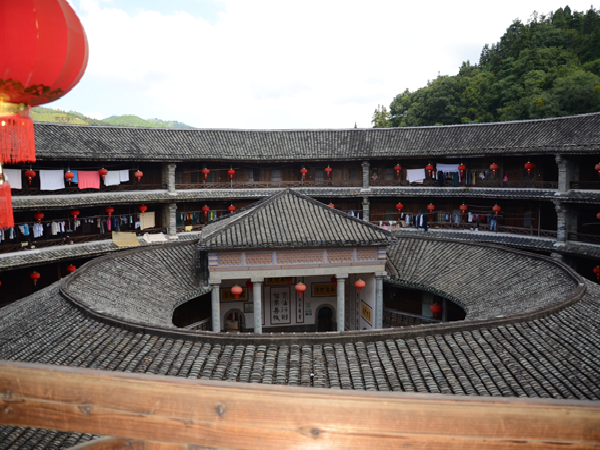 一座土樓就是一個(gè)藝術(shù)殿堂。每一座土樓,又如同一個(gè)“大家族,小社會(huì)”。土樓內(nèi),居住在同一屋頂下的幾十戶幾百人同祖同宗同血緣同家族,過著共門戶、共廳堂、共樓梯、共庭院、共水井的和睦生活。這種聚族同樓而居的生活模式,典型地反映了客家人的傳統(tǒng)家族倫理和家族的親和力。而且,樓內(nèi)的客家人,住著層數(shù)相同、開間面積相等、無明顯朝向差別、更無貴賤等級(jí)之分的均等居室。平等聚居,反映了客家人融洽和睦的家風(fēng)和平等團(tuán)結(jié)的傳統(tǒng)。