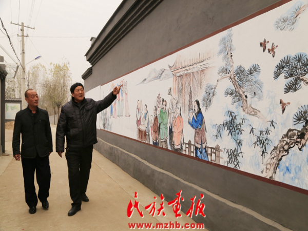 福山營(yíng)村村支部書記羅玉龍(右)和村長(zhǎng)羅術(shù)海(左)介紹街道文化墻上的壁畫
