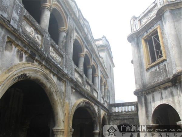 如果說尚德堂是中西混血兒的話,他的兄弟“松柏莊”就是純正的“英國帥哥”。“松柏莊”具有英國新式古典建筑風(fēng)格,共分為兩層,北面設(shè)有陽臺。陽臺及門窗上部均是圓弧形,用帶有高級的石膏線勾邊。陽臺由數(shù)十條羅馬柱支撐,檐口用西洋線腳裝飾,具有英國新式古典建筑風(fēng)格。建筑墻體為白色,與墻上“松柏莊”三個黑色大字相映,十分顯眼,盡顯歐式建筑色彩的視覺沖擊效果。老宅有些殘舊,但墻上的雕畫仍然凹凸有致,圖案清晰可見,這無一不表露這家主人曾經(jīng)的輝煌。