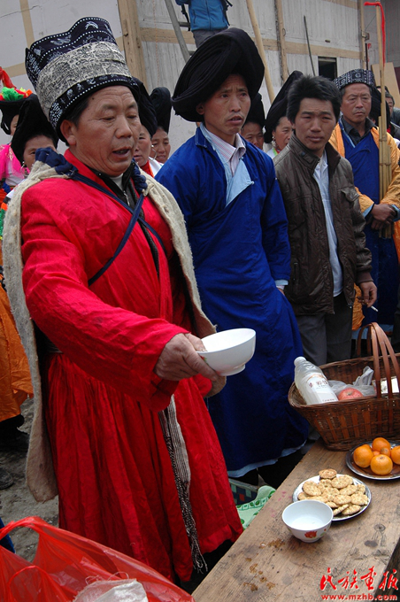 “黃袍錦衣”的寨老手捧牛角帶領(lǐng)族人前去“跳洞”,他們一邊走、一邊舉行祭儀