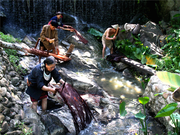 樹皮布是以植物樹皮為原料,經(jīng)過選樹木、扒樹皮、修整、浸泡脫膠、漂洗、曬干、拍打等步驟制成的一種無紡布料。加工好的樹皮布經(jīng)裁剪、縫制可以做成被子、帽子上衣、帽子等。