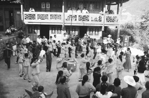 從古至今,每年的正月初九“舍巴節(jié)”(舍巴:土家語擺手舞的意思)、三月三“祭祖節(jié)”、“冬至?xí)?,土家人都要在擺手堂舉行盛大的祭祀活動。農(nóng)閑時的夜晚,在農(nóng)家院壩,點燃熊熊篝火,男女老少在有奏的鑼鼓聲中歡快地舞蹈,盡情地歌唱。清代文人彭施鐸在《竹枝詞》中載:“福石城中錦作窩,土王宮前水生波,紅燈萬盞人千疊,一片纏綿擺手歌?!绷攘葦?shù)語把土家人跳擺手舞的盛況真實地展現(xiàn)出來。