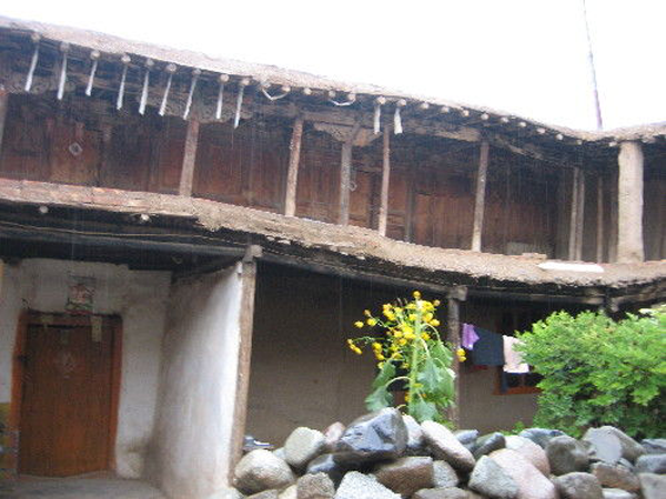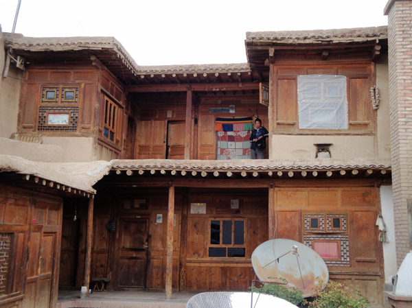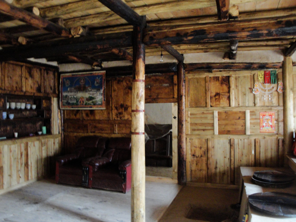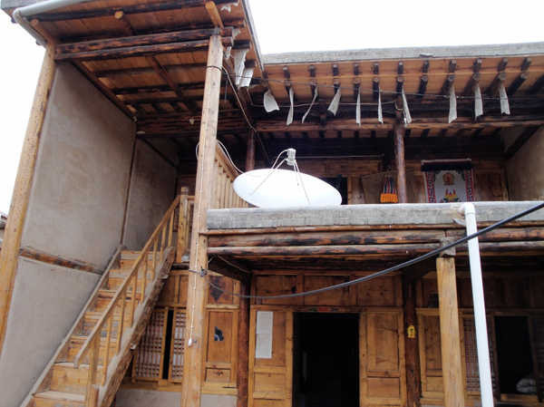 為改善狹小的寨內(nèi)空間,當(dāng)?shù)鼐用窬藿硕幽窘Y(jié)構(gòu)樓房,和青海鄉(xiāng)村民居庭院寬敞的特點(diǎn)形成了反差。寨內(nèi)民居庭院多為四合院式,房屋為土木結(jié)構(gòu)平頂房,一般民居都有飛椽花藻之類(lèi)。屋內(nèi)一般以木板作隔扇,室內(nèi)有護(hù)炕木板、護(hù)墻木板墻圍,且多雕花草于其上。房屋一般面闊三間,正面以木板隔墻并裝上木板條方格小花窗。佛堂設(shè)在二樓,佛堂所在的房屋一般都是上房,和佛堂不同向的兩邊廂房一般做臥室。院落中央一般都有豎掛經(jīng)幡的旗桿,還設(shè)有桑臺(tái),具有明顯的藏式特點(diǎn)。