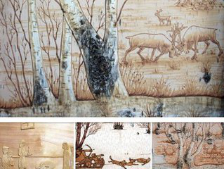 樺樹皮畫是樺樹皮工藝品中重要一種,它從簡單適用的生活必需品中脫穎而出,成為滿族鄂倫春、鄂溫克、達(dá)斡爾、赫哲等北方狩獵民族精神文化特殊需求的用品。樺樹皮畫是用樺樹皮為繪畫材料,運用樺樹皮天然形成的紋理、樹節(jié)為繪畫元素,利用獨特的繪畫工藝和技術(shù)繪制的以反映游獵民族社會生活為內(nèi)容,體現(xiàn)游獵民族思鄉(xiāng)情懷的工藝美術(shù)品。樺樹皮畫主要使用揭皮手法和碳化工藝來進行創(chuàng)作,崇尚自然和環(huán)保理念。自然古樸、不可復(fù)制、裝飾性強和游獵民族的民族特性,是樺樹皮畫的幾個突出特點。