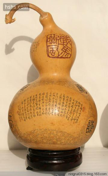 葫蘆雕集繪畫、書法、篆刻藝術(shù)于一體,傳承和發(fā)展了我國傳統(tǒng)“葫蘆文化”。甘肅的雕刻葫蘆最早出產(chǎn)于蘭州,距今約100多年,據(jù)說早期的蘭州雕刻葫蘆比較簡單,對葫蘆不會做刮皮、磨光等加工處理,也不填色;只是在葫蘆表皮雕刻出山水、風(fēng)景或戲劇人物,作為兒童的玩具,在街頭巷尾出售。到了清代光緒年間,秀才蘭州人李文齋對葫蘆雕刻工藝做了改進。他針對當(dāng)時雕刻表面粗糙、題材單調(diào)的弊端,首先將葫蘆原生表皮刮去、磨光,并用鏹水混合燃料,染成紅黃二色,是雕刻的景物不易脫落;其次,擴大圖案創(chuàng)作題材,在原有山水、花草等圖案基礎(chǔ)上,增加了如《桃花源記》、《蘭亭集序》、《竹林七賢》等歷史文化和神話故事,形成了圖文并茂的題材格局;最后是在雕刻工具上采用了以針代刀,使圖案形象更加情景交融,栩栩如生。其雕刻葫蘆的特點主要是求其意態(tài)之美,追求神似;人物寥寥數(shù)筆,山水花卉濃淡相宜,形神兼具,求其風(fēng)雅;題款文字、細如蚊足,點綴成行,瀟灑自如。
