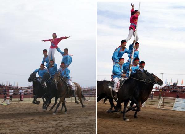 蒙古族的馬術(shù)表演非常精彩,有很多項(xiàng)目?!翱缭秸系K”是在運(yùn)動(dòng)場(chǎng)跑道上每隔幾十米設(shè)置一個(gè)高1米的跨欄。跑道終端立著一個(gè)直徑約2米的火圈,矯健的坐騎從起跑線踏蹄起跑,越過(guò)跨欄,鉆過(guò)火圈直達(dá)終點(diǎn)?!俺笋R斬劈”是在200-250米的距離之間樹(shù)起十幾個(gè)目標(biāo)。騎手們手持馬刀,疾馳如飛,經(jīng)過(guò)一個(gè)個(gè)目標(biāo)時(shí)舉刀劈砍,刀起標(biāo)落?!榜R上技巧”是由運(yùn)動(dòng)員們?cè)陲w馳的馬背上做出各種造型動(dòng)作。運(yùn)動(dòng)員一般八九歲就要在馬術(shù)隊(duì)接受嚴(yán)格的訓(xùn)練。技巧表演可分單項(xiàng)和多項(xiàng),其中又包括單人單馬、單人雙馬、雙人雙馬和多人多馬。一匹飛奔的馬經(jīng)過(guò)騎手身邊,騎手可以突然抓住馬鬃翻身上馬,又會(huì)突然下馬腳尖點(diǎn)地再躍上馬背。其他技巧還有在馬背上“空翻倒立”“側(cè)方隱蔽”“樓里藏身”以及驚險(xiǎn)的“馬上疊羅漢”等表演【如圖,劉軍攝影,編者修剪合成兩圖】。
