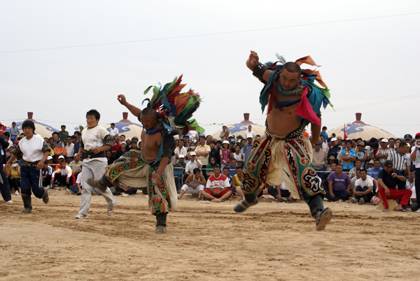 蒙古族摔跤(搏克)既不同于中國(guó)式摔跤,也不同于日本的相樸,其規(guī)則、方法、服裝、場(chǎng)地等方面都有自己的特點(diǎn)。比賽規(guī)則和方法是:不分等級(jí)(不分年齡、不分體重),沒(méi)有人數(shù)限制,只要是2、4、6、8、16、32、64、128等雙數(shù)即可。所有選手由德高望重的裁判負(fù)責(zé)編排配對(duì)或抽簽配對(duì)后上場(chǎng)。比賽實(shí)行單淘汰制,一跤定勝負(fù),失敗者不許再上場(chǎng)。每輪淘汰半數(shù)。裁判員發(fā)令后,雙方握手致意,然后開(kāi)始交鋒,一般不限時(shí)間,可以采取勾、拉、踢、絆、推、抱、舉等各種方法和技巧,但不能抱腿摔,也不準(zhǔn)亂踢,更不能扯褲子,膝蓋以上任何部位著地即為失敗。摔跤手有專用服裝,上身為牛皮或帆布制成的緊身半袖坎肩“昭德格”,下穿肥大的摔跤褲,腳蹬蒙古靴,頸上套五顏六色的布條項(xiàng)圈。比賽場(chǎng)地簡(jiǎn)單,只要有一片草坪或松軟空地,觀眾席地圍坐,摔跤手就可以在中間進(jìn)行比賽。賽前,雙方都有人高唱挑戰(zhàn)歌,以造聲勢(shì)。摔跤手入場(chǎng)、退場(chǎng)時(shí)都要模仿虎步或鷹步動(dòng)作,跳躍行進(jìn),威武雄壯。冠軍獲重獎(jiǎng),并在民間享有極高聲譽(yù)【圖為跳躍入場(chǎng)的摔跤手,劉軍攝影】。